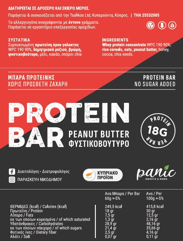 Η νέα Μπάρα Πρωτεΐνης Panic Sweets συνδυάζει την υψηλή διατροφική αξία με την αυθεντική γεύση του Τροόδους. Με 18g πρωτεΐνης ανά μπάρα222, είναι το απαραίτητο σνακ για μετά την προπόνηση ή για ένα δυνατό ξεκίνημα στη μέρα σας.